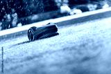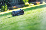 Robotic Lawn Mower Maintaining a Green Lawn in a Sunny Garden During the Afternoon