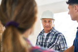 Confident senior male contractor wearing hardhat looking at young female worker in incomplete house site