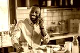 A smiling African-American man enjoys a healthy breakfast while talking on his phone in a modern kitchen. Fresh fruits, salad, and juice are on the table as he eats and multitasks.