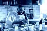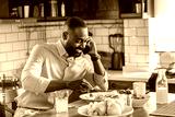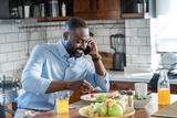 A smiling African-American man enjoys a healthy breakfast while talking on his phone in a modern kitchen. Fresh fruits, salad, and juice are on the table as he eats and multitasks.
