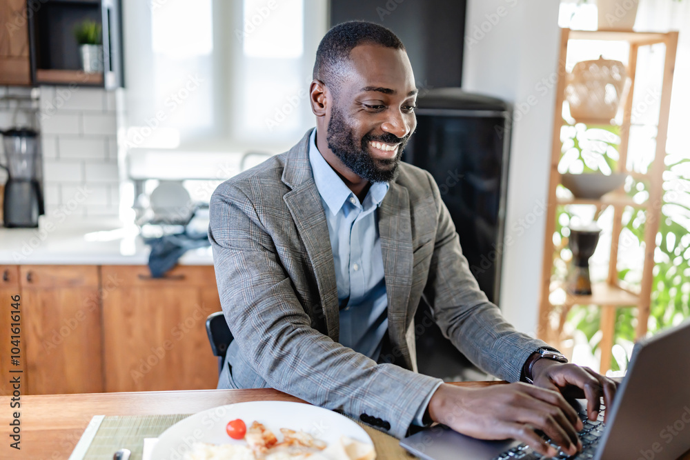 African-American man working on a laptop while eating breakfast at home. He is multitasking in a bright, modern kitchen, combining work and a healthy meal.