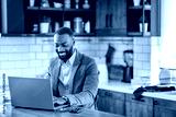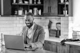 Focused African-American man working on his laptop at home, dressed in business attire. He appears engaged and concentrated in a modern kitchen workspace.