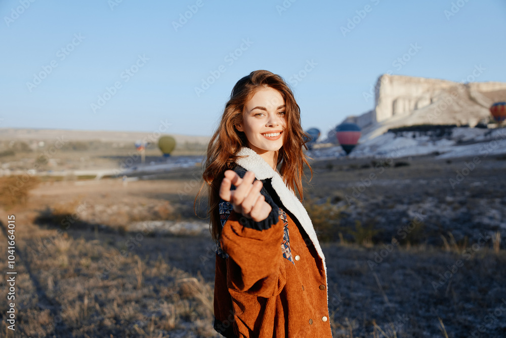 Woman standing in serene field with hand raised towards the sky in a moment of peaceful reflection