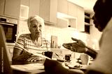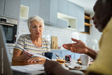 Senior couple discussing bills at kitchen table