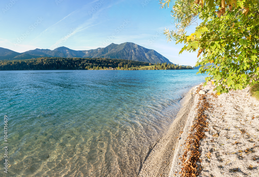 sunny lakeside Walchensee with colorful maple leaves and mountain view, upper bavaria