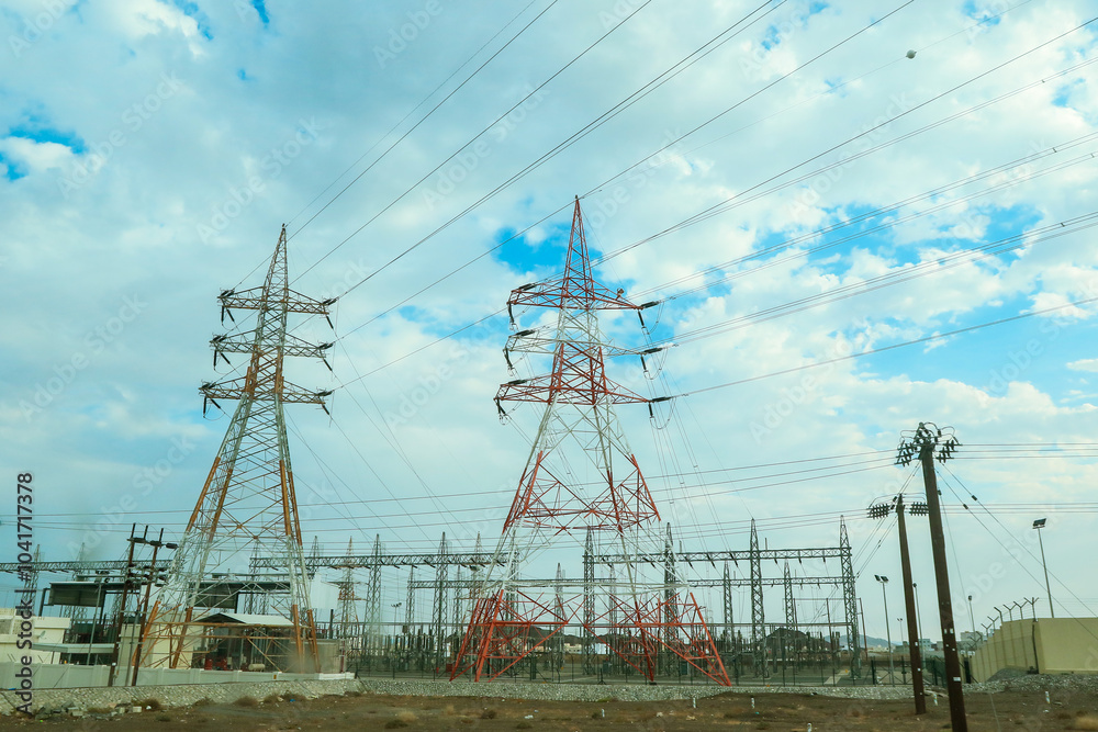 Electric towers and infrastructure in Oman under a cloudy sky during the day
