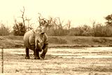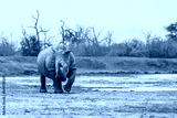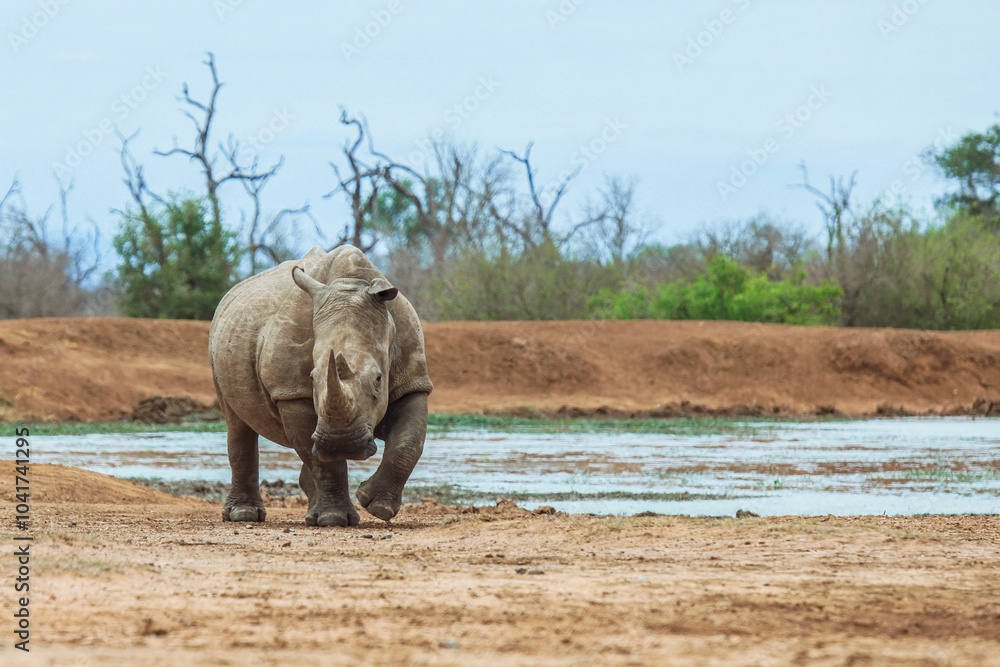 A lone rhinoceros grazes near a watering hole in the quiet landscape of Eswatini\'s national park during the late afternoon hours