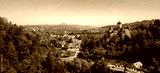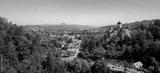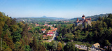Bran Castle overlooking the scenic village and lush landscape during a clear sunny day