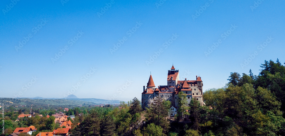 Bran Castle stands majestically against a clear blue sky surrounded by lush greenery in Romania