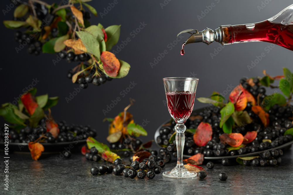 Black chokeberry liqueur and fresh berries on a black stone table.