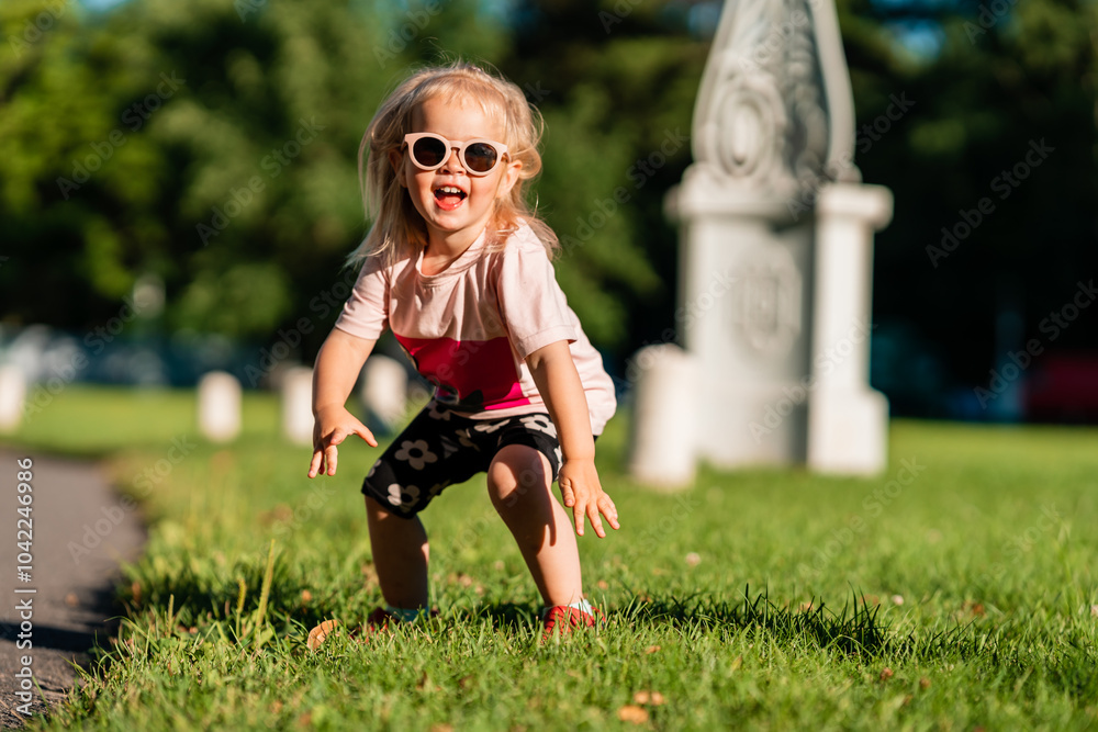 Caucasian Child toddler girl in sunglasses walks in the park in summer.