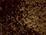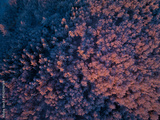 AERIAL TOP DOWN: Beauty of a spruce forest blanketed in freshly fallen snow. Soft light of rising sun highlights frosty treetops in pastel shades, revealing natural patterns and texture from above.