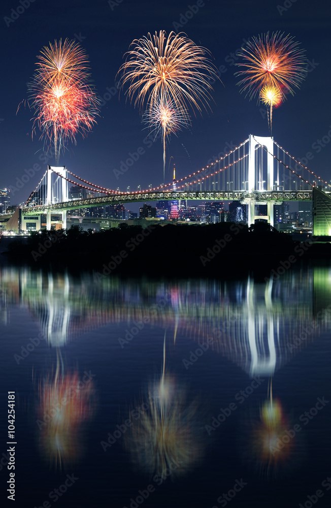 Fireworks celebrating with mirror reflection over Tokyo Rainbow
