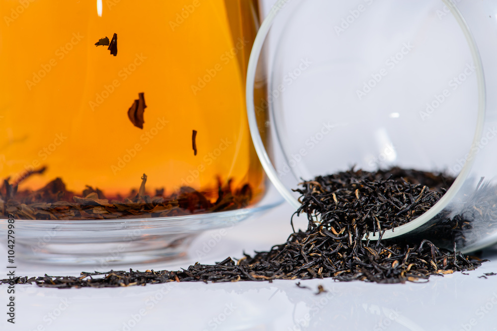 close-up of Chinese tea Black Gold and brewed tea in a teapot, s
