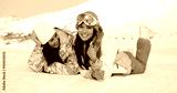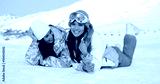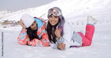 Cute pair of female twins in long black hair and ski clothing giggling while laying down on ground at bottom of ski slope with mountain behind them.
