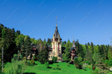 Peles Castle stands majestically surrounded by lush forests in Romania on a clear day
