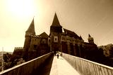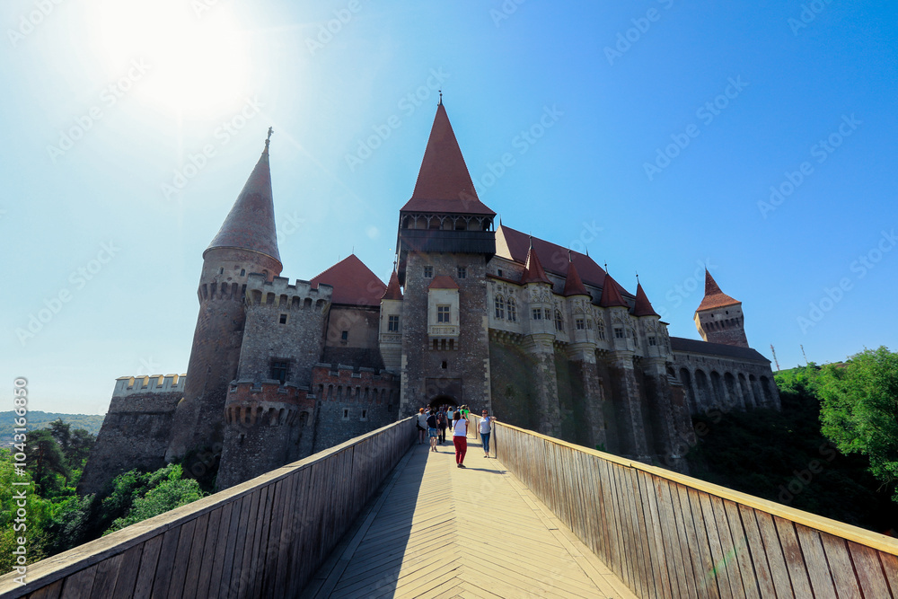 Visitors walking towards Corvin Castle in Romania under a clear blue sky
