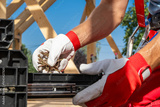 Construction Worker Assembling a Wooden Frame With Safety Gear and Tools on a Sunny Day