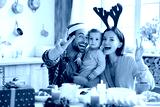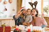 Young happy caucasian family of three taking selfie videocall looking at camera while celebrating Christmas New Year in Santa Claus red hats at home