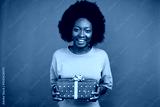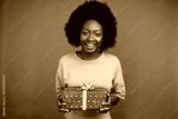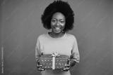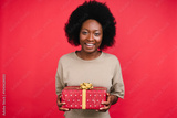 Cheerful african teenage girl with afro hairstyle in casual clothing holding a red present gift box with ribbon isolated over red background. Celebrating holidays concept