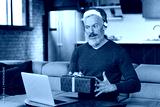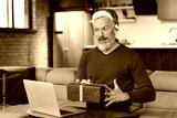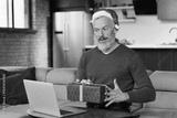 Surprised mature middle-aged man in Santa Claus red hat receiving present gift boxes, celebrating Christmas New Year online remotely on laptop, vlogging blogging unwrapping box at home