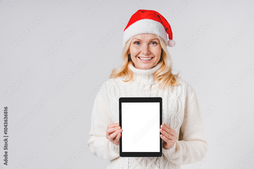 Caucasian mature woman in red Santa Claus hat holding showing digital tablet blank screen, mockup copy space for Christmas New Year sale discount offer on grey background