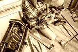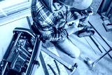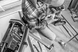 A Construction Worker Uses a Toolbox While Installing Flooring in a Home Renovation Project