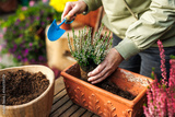 Planting heather flowers outdoors. Woman is putting soil into flower pot. Autumn floral decoration