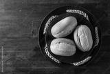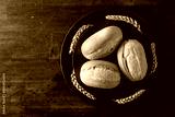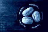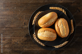 French buns and wheat ears on a black plate.