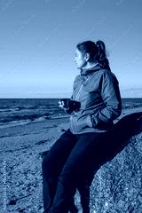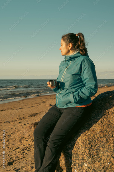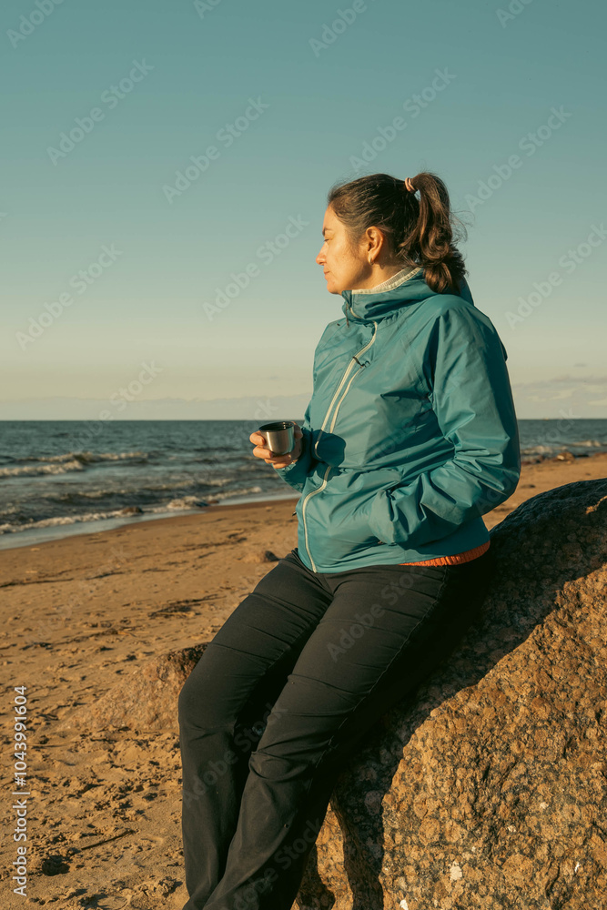 Woman enjoying hot beverage on rock by the ocean at sunset