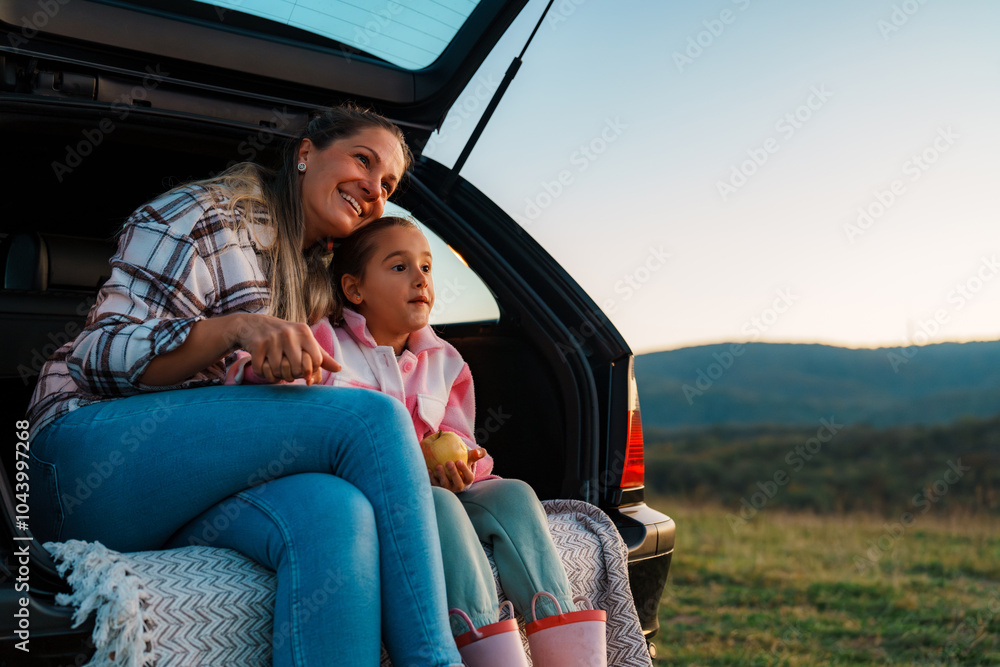 Adorable little girl and her mother sitting in car trunk while enjoy view in sunset.