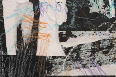 Torn, ripped paper pieces collage. Art Acrylic brushstroke smear blot painting wall. Abstract texture background.