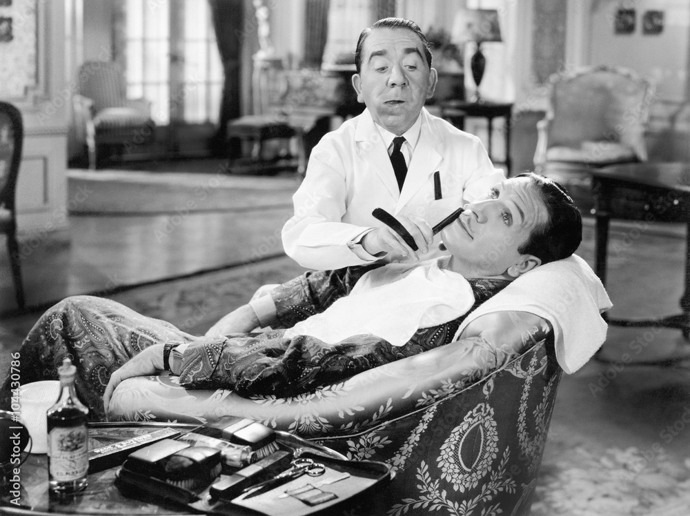 Barber shaving a man in his living room