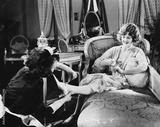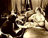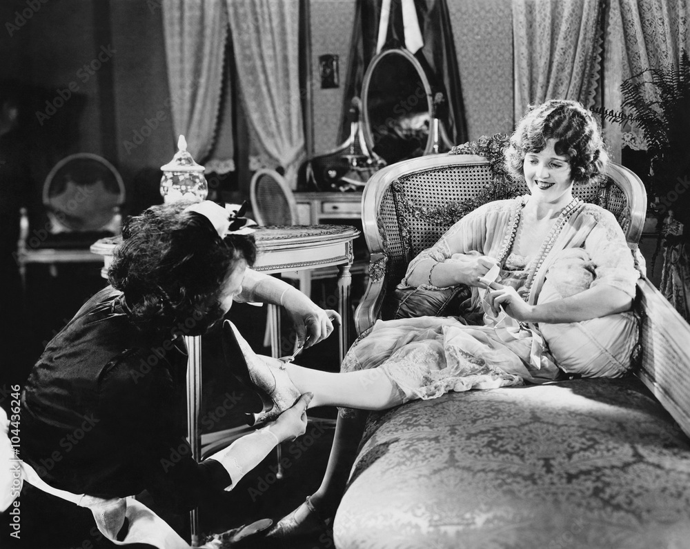 Woman having shoes fastened by maid