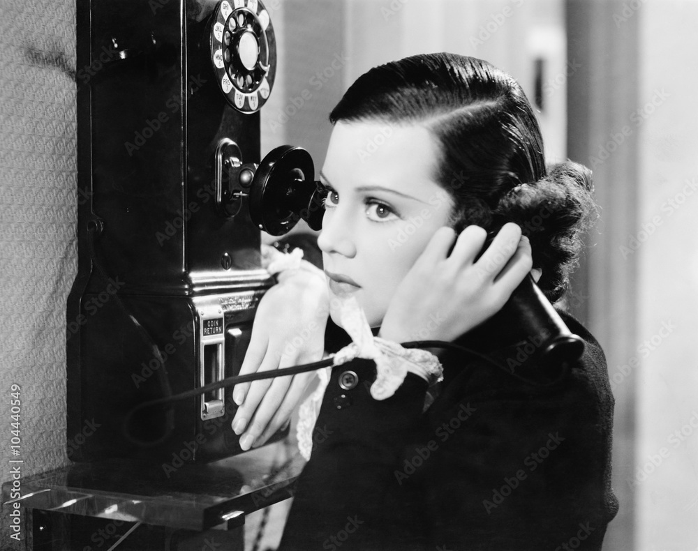 Profile of a young woman talking on a payphone