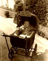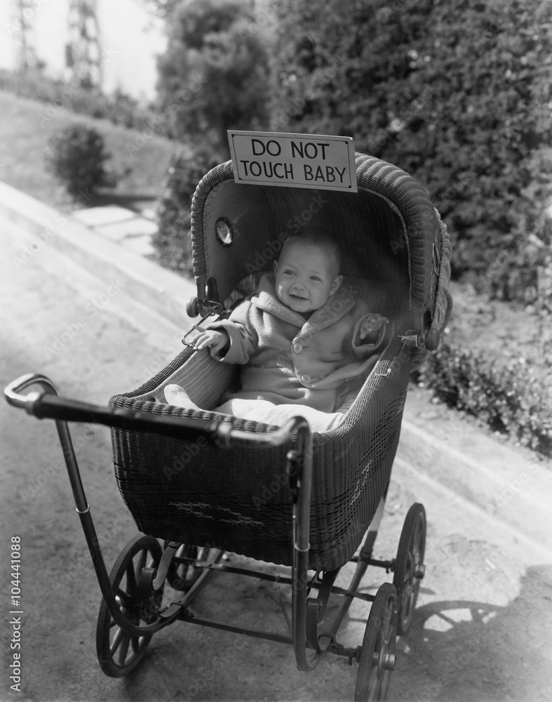 Baby with sign saying do not touch baby