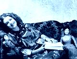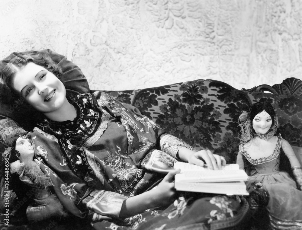 Woman in a Chinese print dress lying on the sofa with her dolls and a book