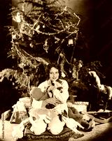 Teenage girl hugging stuffed animals under Christmas tree