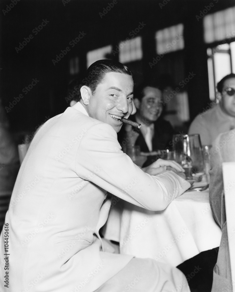 Smiling man with a cigar in his mouth in a restaurant