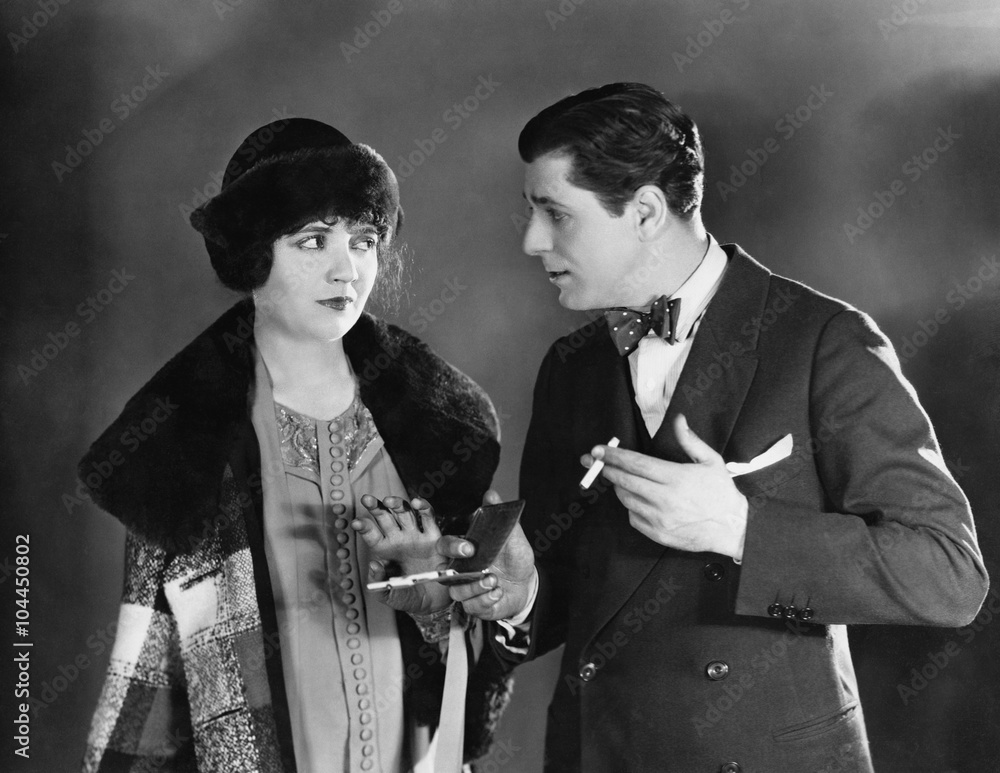 Man with cigarettes talking to woman