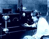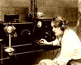 Woman sending Morse code using telegraph