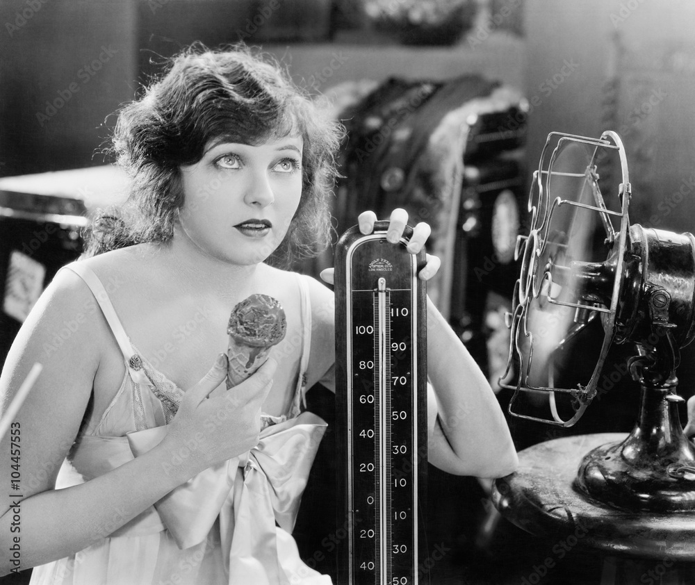 Young woman sitting next to a fan and a thermometer looking hot and eating an ice cream