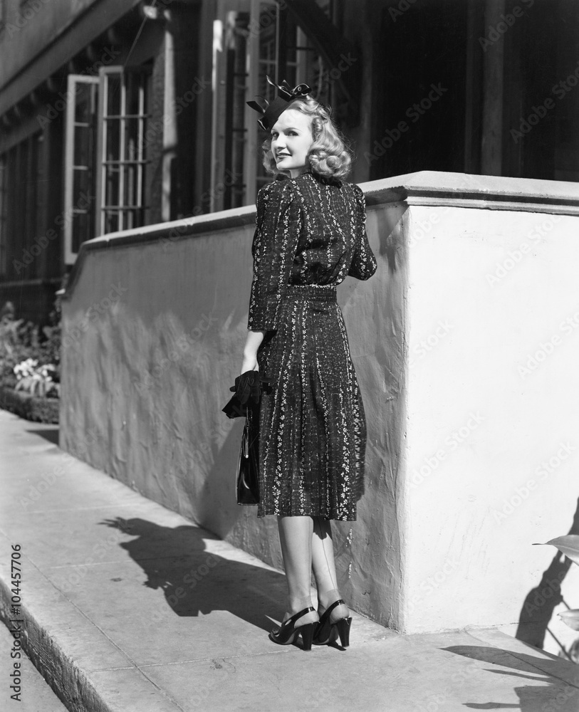 Rear view of a young woman standing in front of a wall looking over her shoulder
