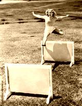 Woman jumping hurdles labeled with years