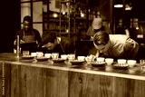Barista training in a modern roastery with managers taking notes