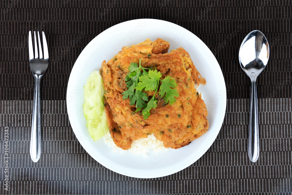 Traditional Thai style, Omelet on Thai Jasmine Rice on Brown Cloth Background.
