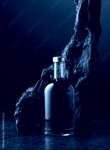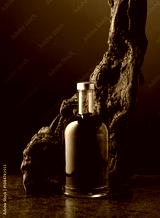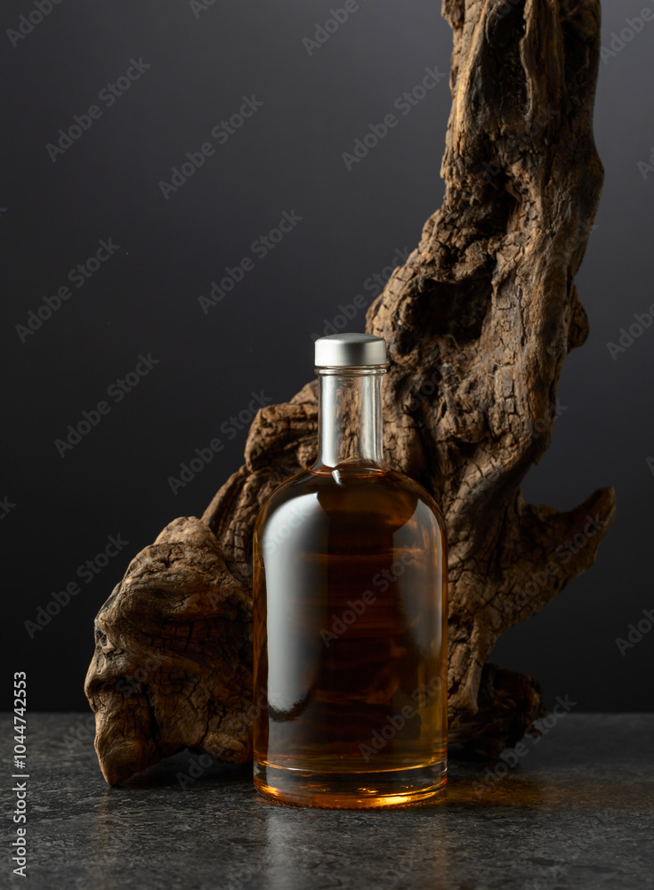 Bottle of whiskey and old snag on a black background.