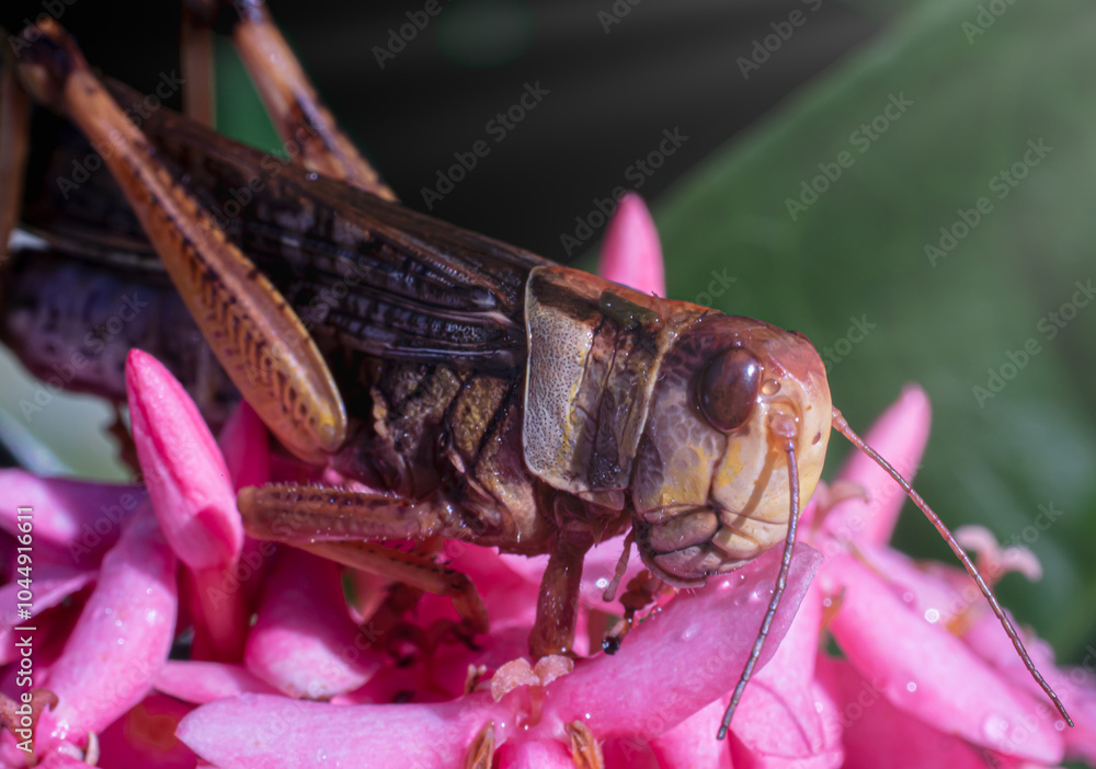 Grasshopper on a flower. Macro photography of an insect. Grasshopper on a flower with morning dew. Grasshopper coming out to feed in the morning.