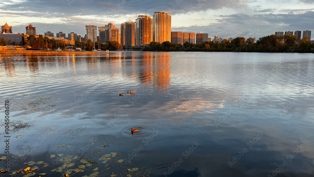 A city skyline is reflected in the water. The water is calm and still. The sky is a mix of orange and blue