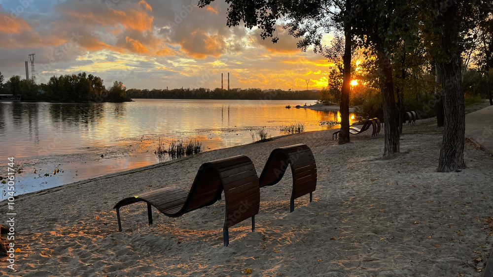 A beach with a lake and a sunset in the background. The sun is setting and the sky is orange. There are two benches on the beach, one of which is empty